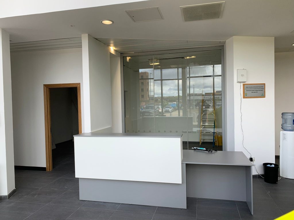 WM Montgomery & Sons were delighted to have been commissioned to work with Viridor Waste Management again, this time at their plant in Polmadie Glasgow. The work included the creation of a new reception area with a bespoke finished reception desk. Everything for this project was manufactured in our brand new workshop in Govan.